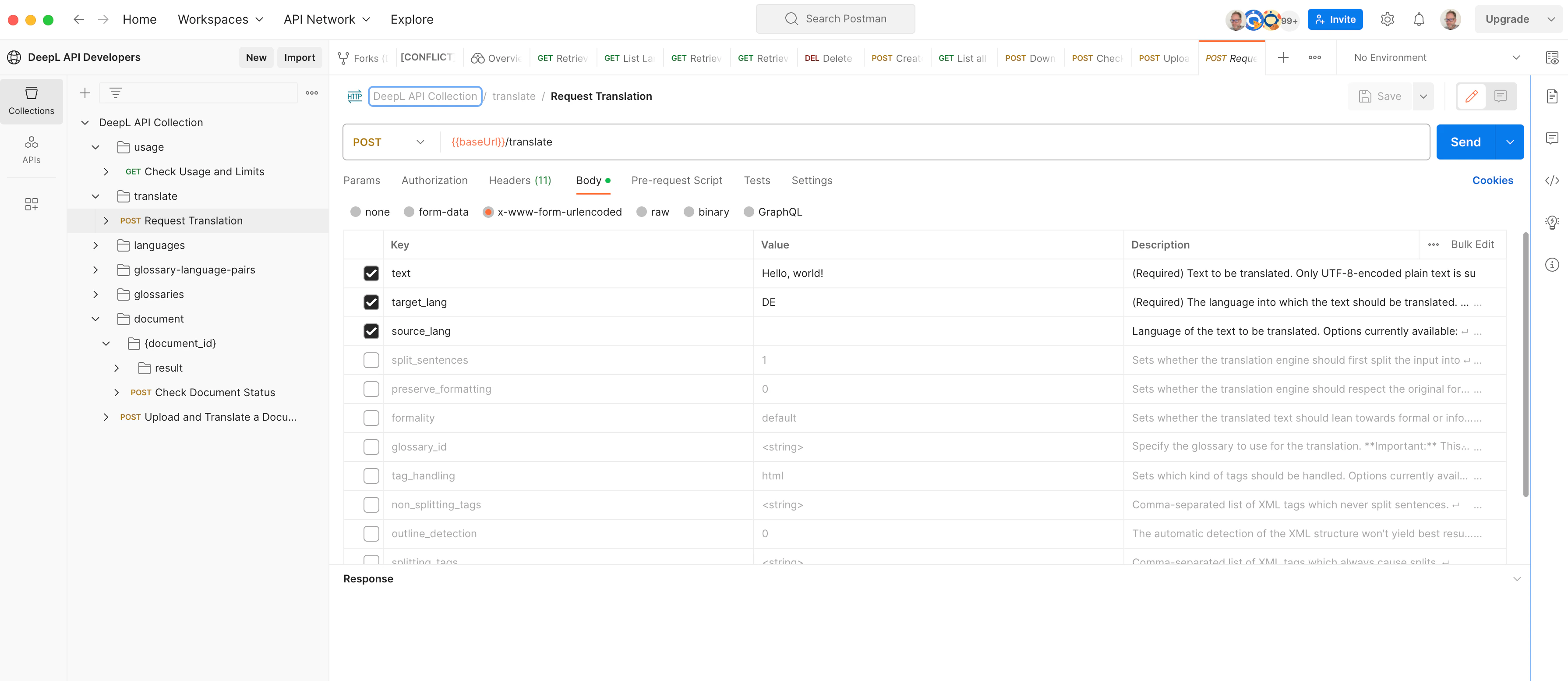 baseUrl variable depending on your subscription (https://api.deepl.com/v2 for Pro, https://api-free.deepl.com/v2 for Free).